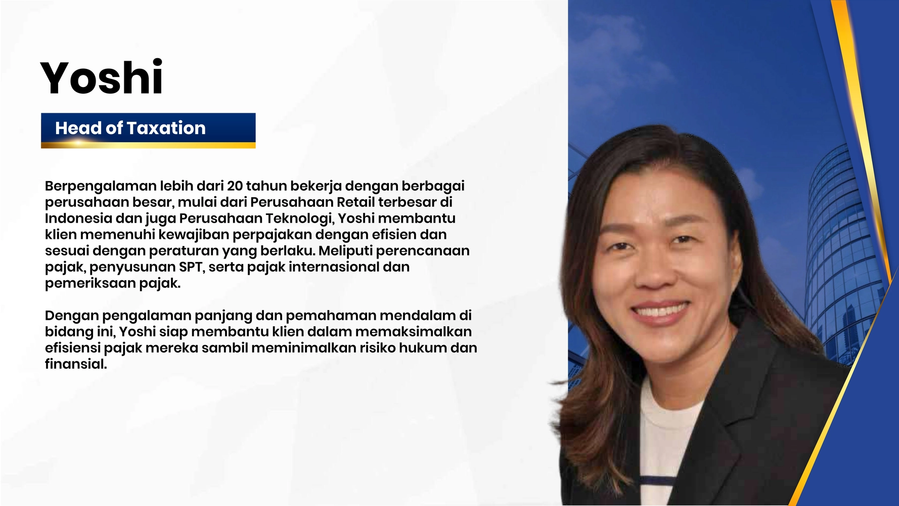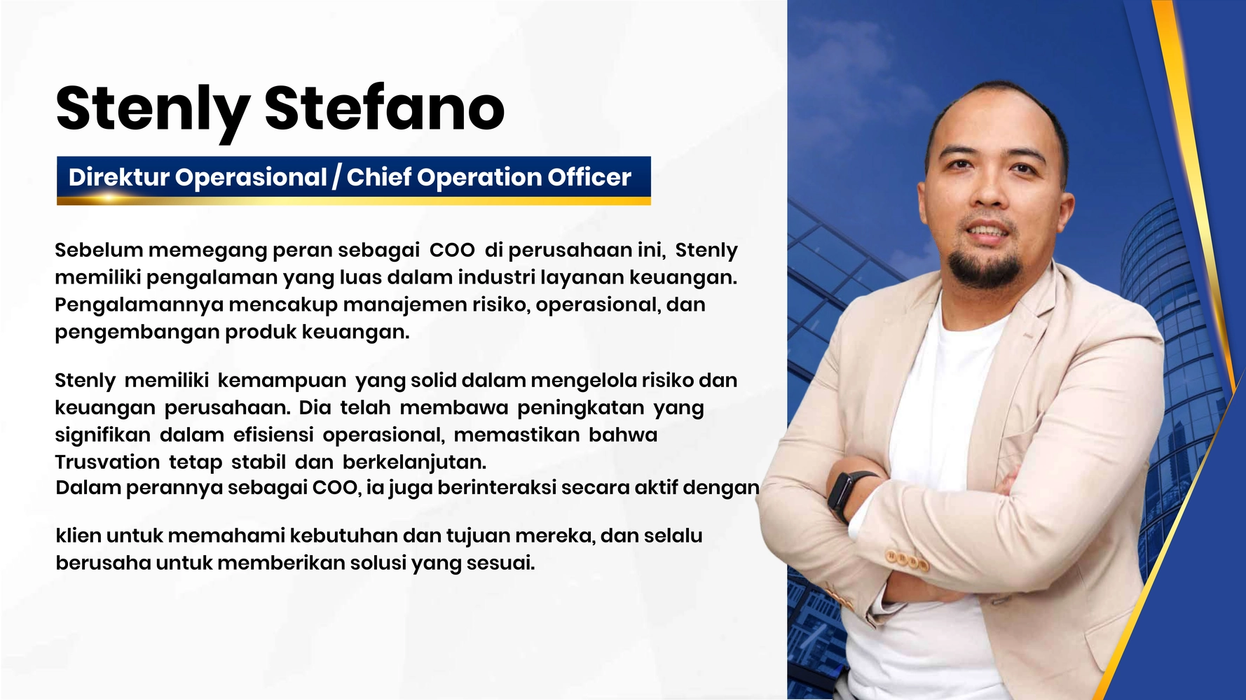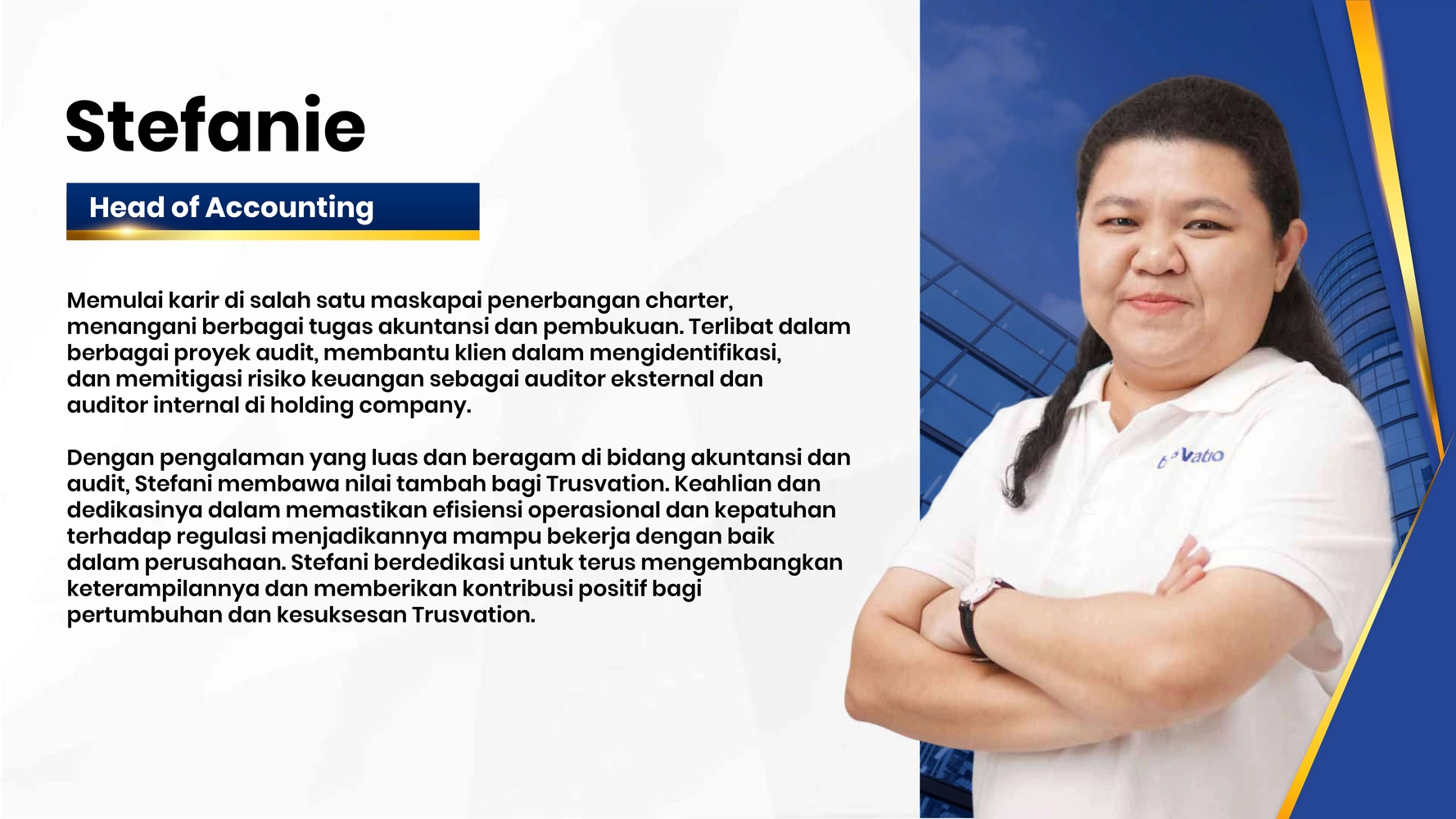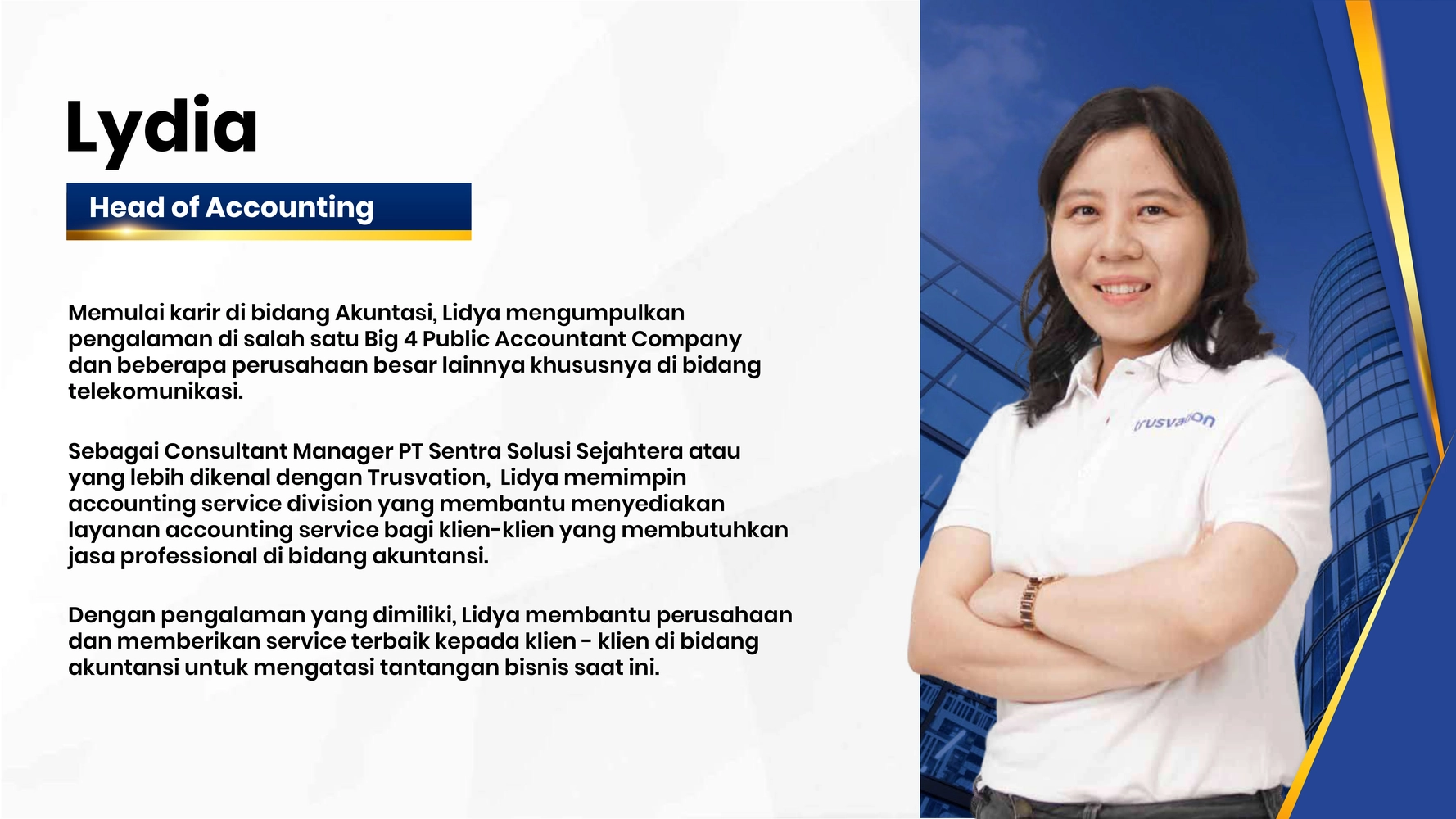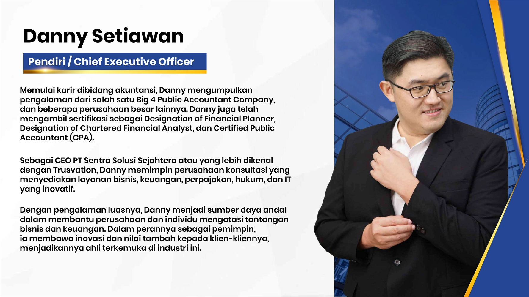 Trusvation menghadirkan sinergi profesional multidisiplin dengan standar global untuk menavigasi kompleksitas bisnis Anda. Oleh karena itu, kami melampaui sekadar aspek finansial dengan menyatukan keahlian strategi operasional, kepatuhan, dan manajemen risiko yang terintegrasi. Dengan latar belakang pengalaman di firma kelas dunia, tim kami memastikan setiap keputusan bisnis Anda memiliki landasan yang aman dan kompetitif.